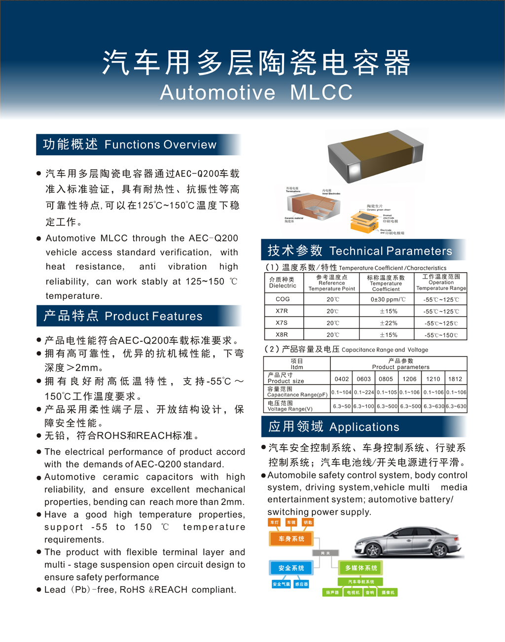 汽車用多層陶瓷電容器通過(guò)AEC-Q200車載準(zhǔn)入標(biāo)準(zhǔn)驗(yàn)證,具有耐熱性、抗振性等高可靠性特點(diǎn),可以在125℃~150℃溫度下穩(wěn)定工作。